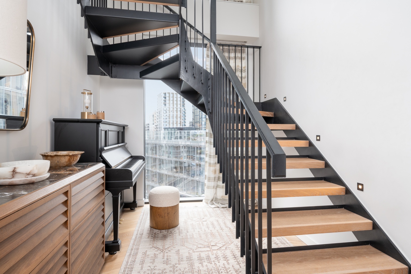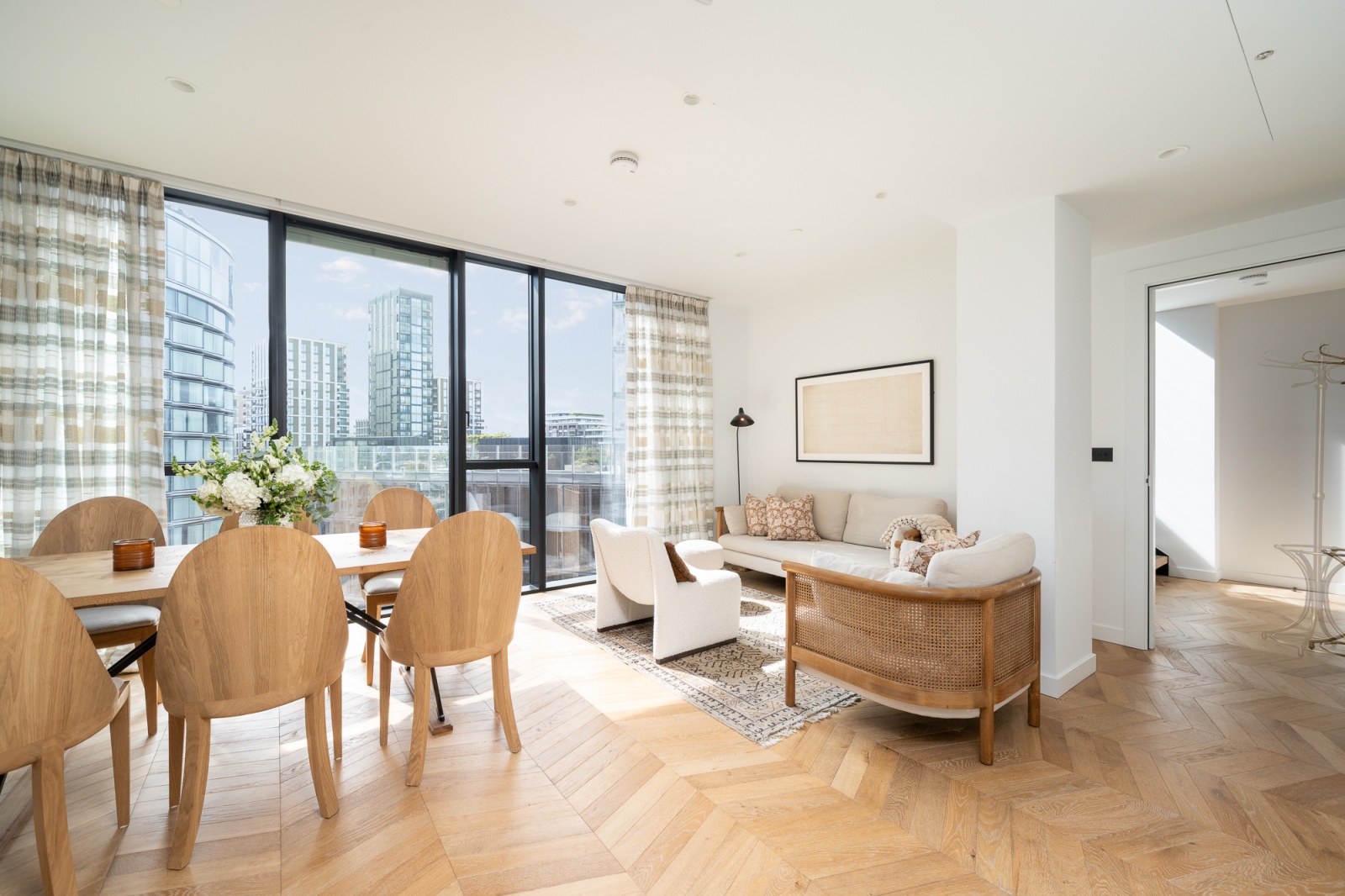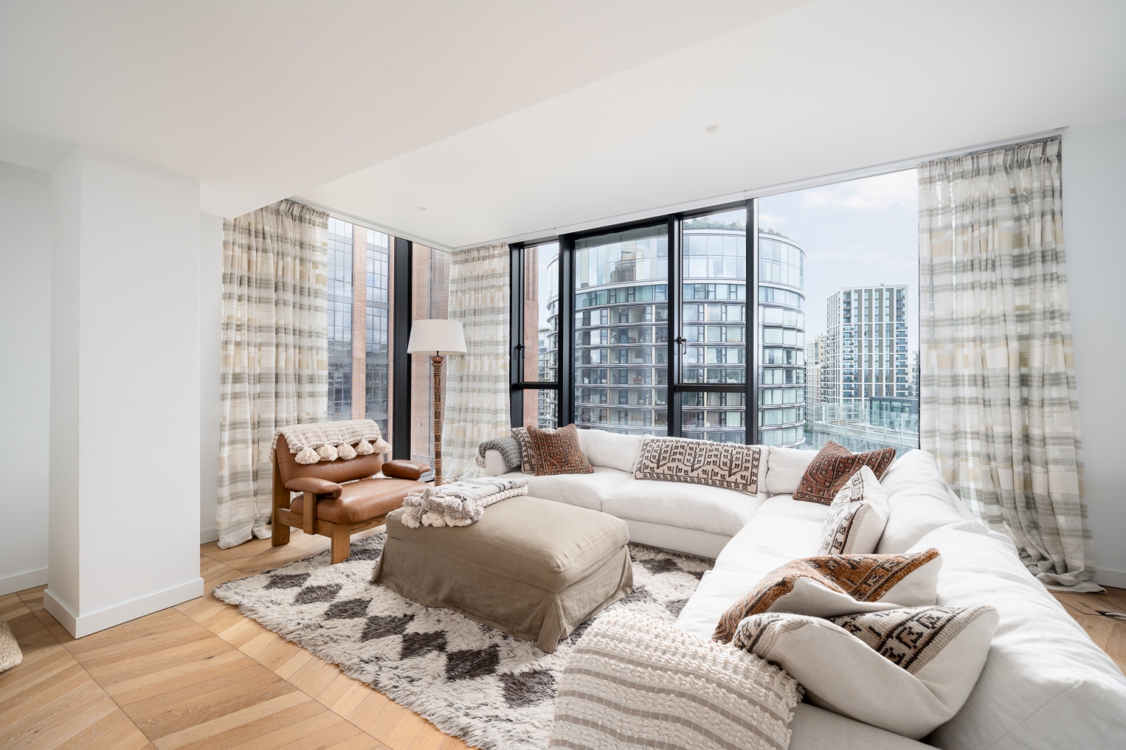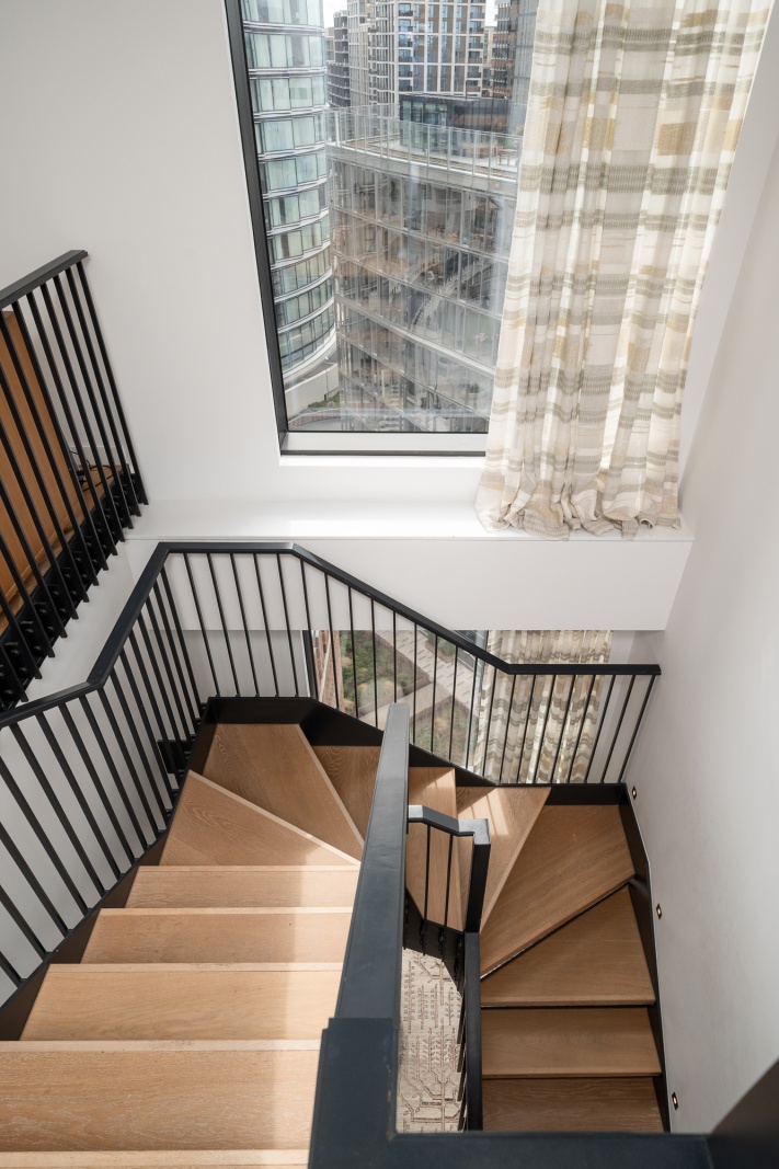 Its unique location on the corner of the building means it faces both east and south so is flooded with natural light all day, retaining privacy while also affording impressive views of the surrounding Norman Foster and Frank Gehry buildings.