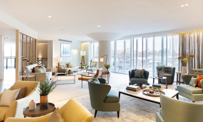 It has a unique layout with the bedrooms either side of the living area, ensuring privacy and separation, while the living area itself is spacious and filled with natural light. The winter garden is where the property stands out from the rest spanning 240sqft and creating multiple extra zones to the property and offering far reaching views of the city and the iconic chimneys of Battersea Power Station.