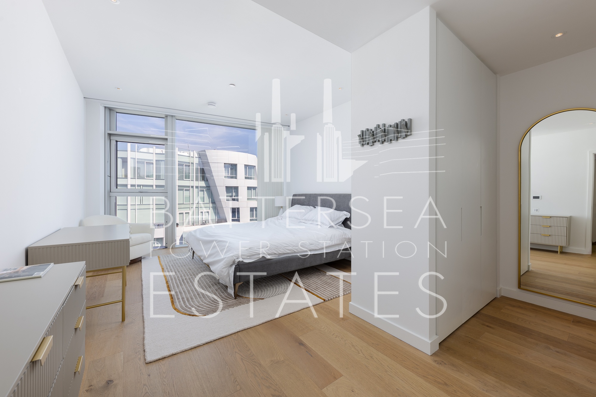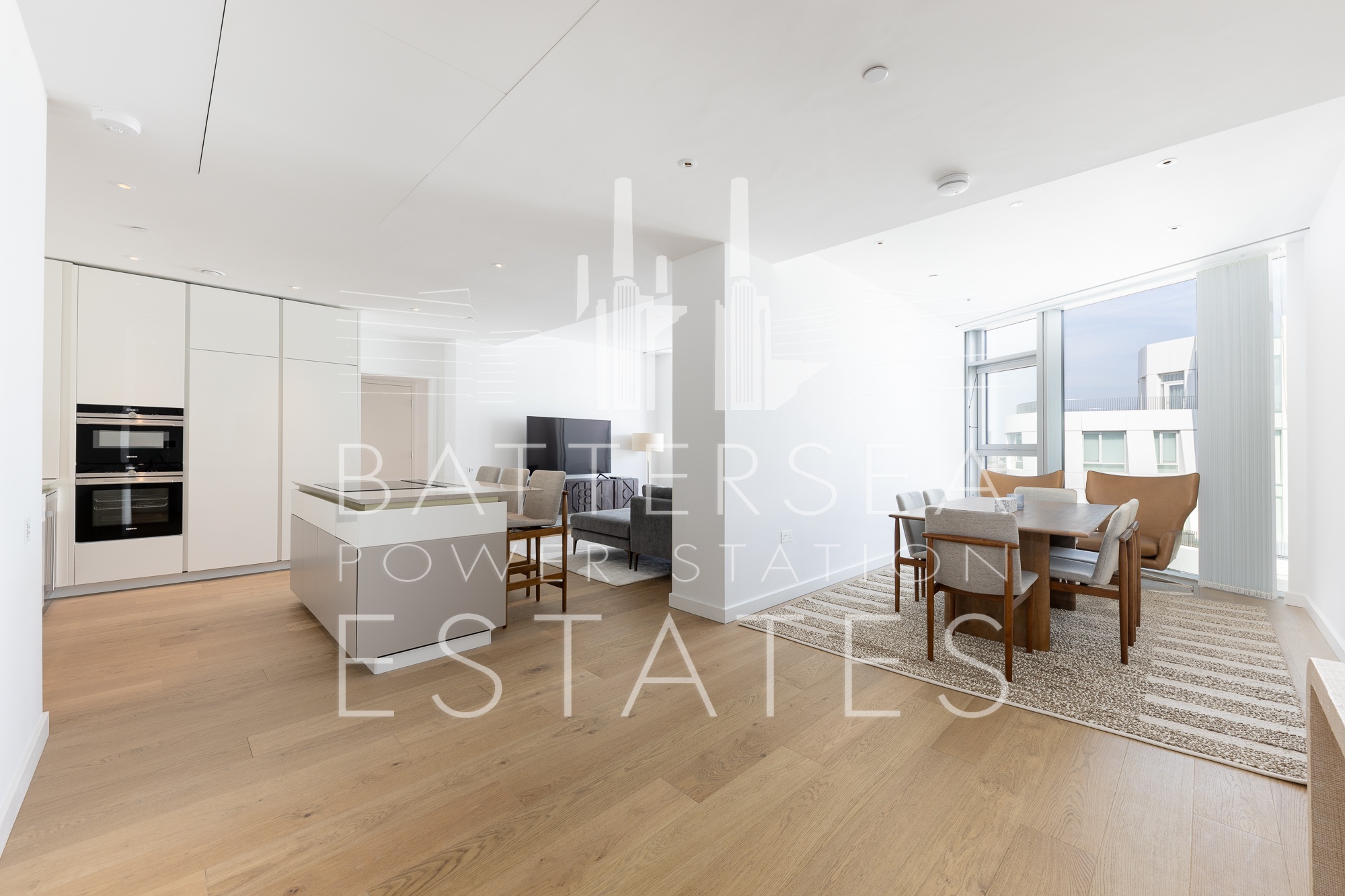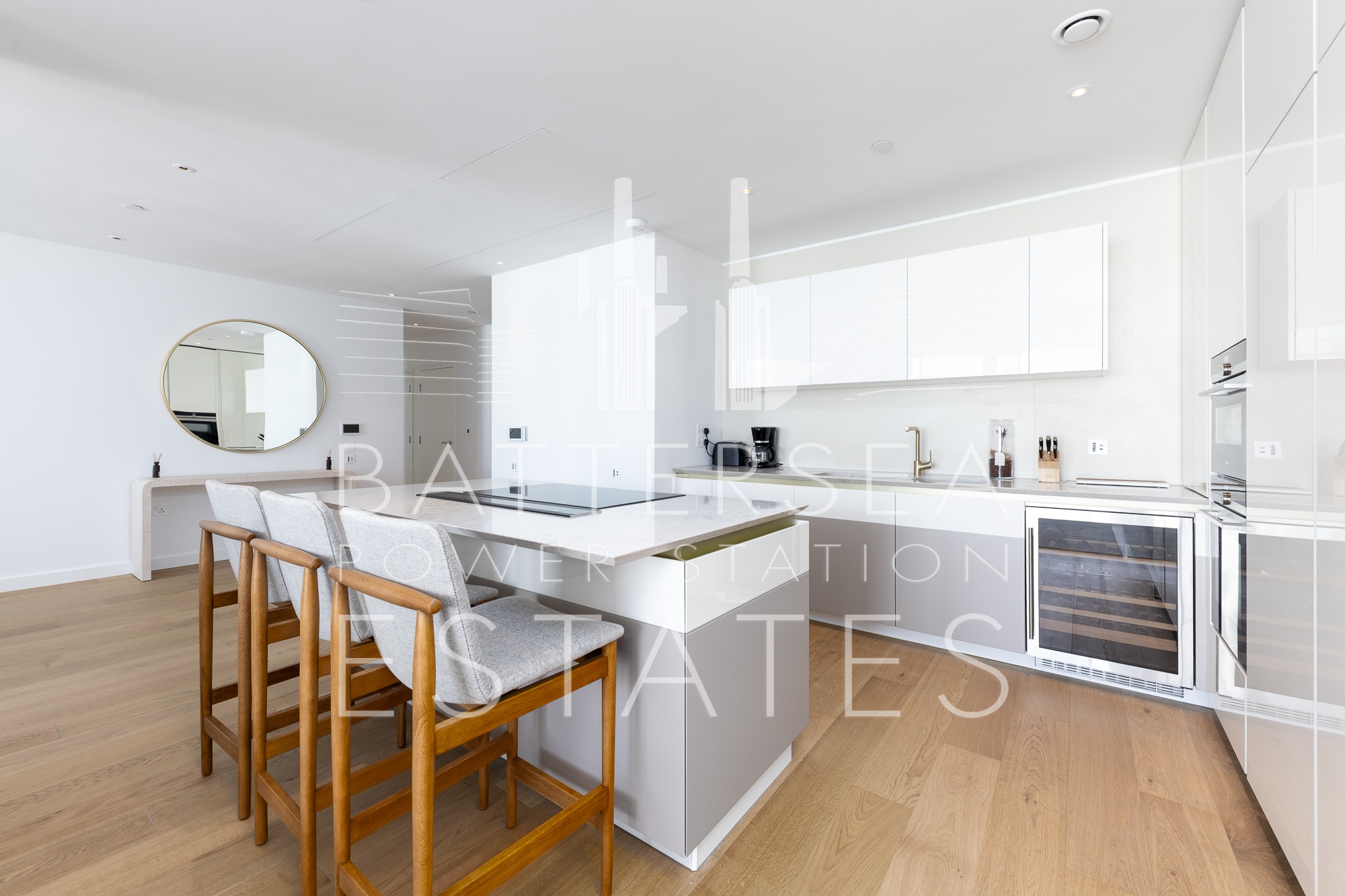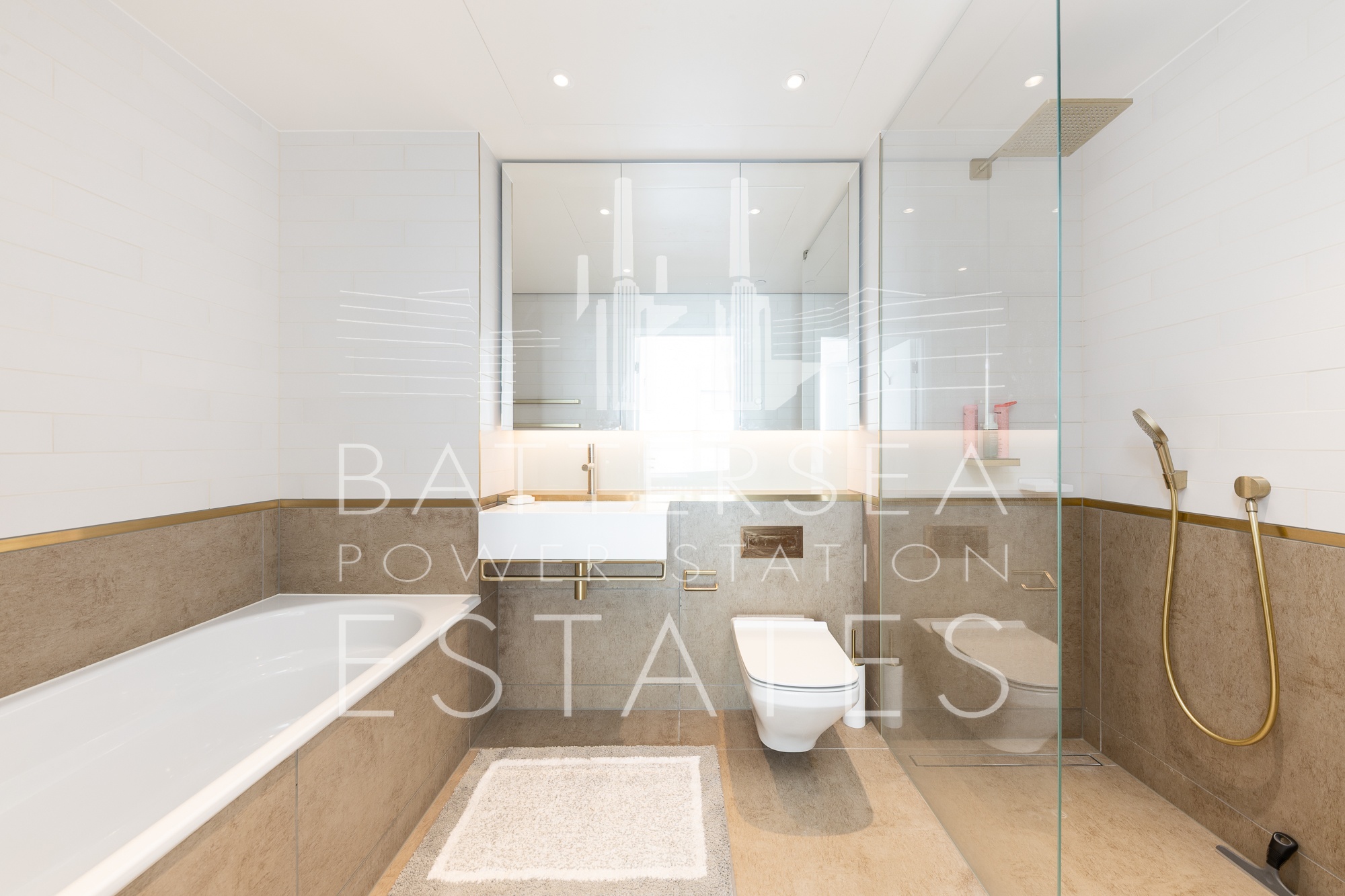 This stunning apartment comprises of a modern open plan kitchen and dining space, that includes a kitchen island and Siemens integrated appliances and a bright reception room benefitting from floor to ceiling windows which flood the room with natural light. The winter garden of 116 sq ft provides additional entertaining space and offers wonderful views over the Gehry buildings and the iconic Power Station with the River Thames in the distance. There is a fantastic master suite with extensive built in storage and en suite, as well as two further well proportioned bedrooms with en suite and a separate guest WC, all with views towards the Power Station. Finished to an exceptional standard with wood flooring throughout, the apartment has a heating and cooling system in the living room and bedrooms and underfloor heating in the bathrooms.