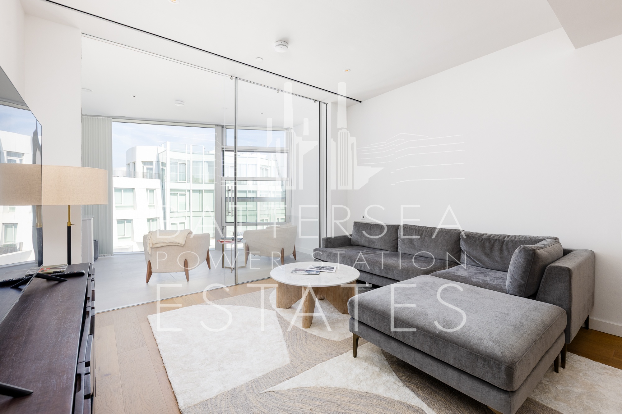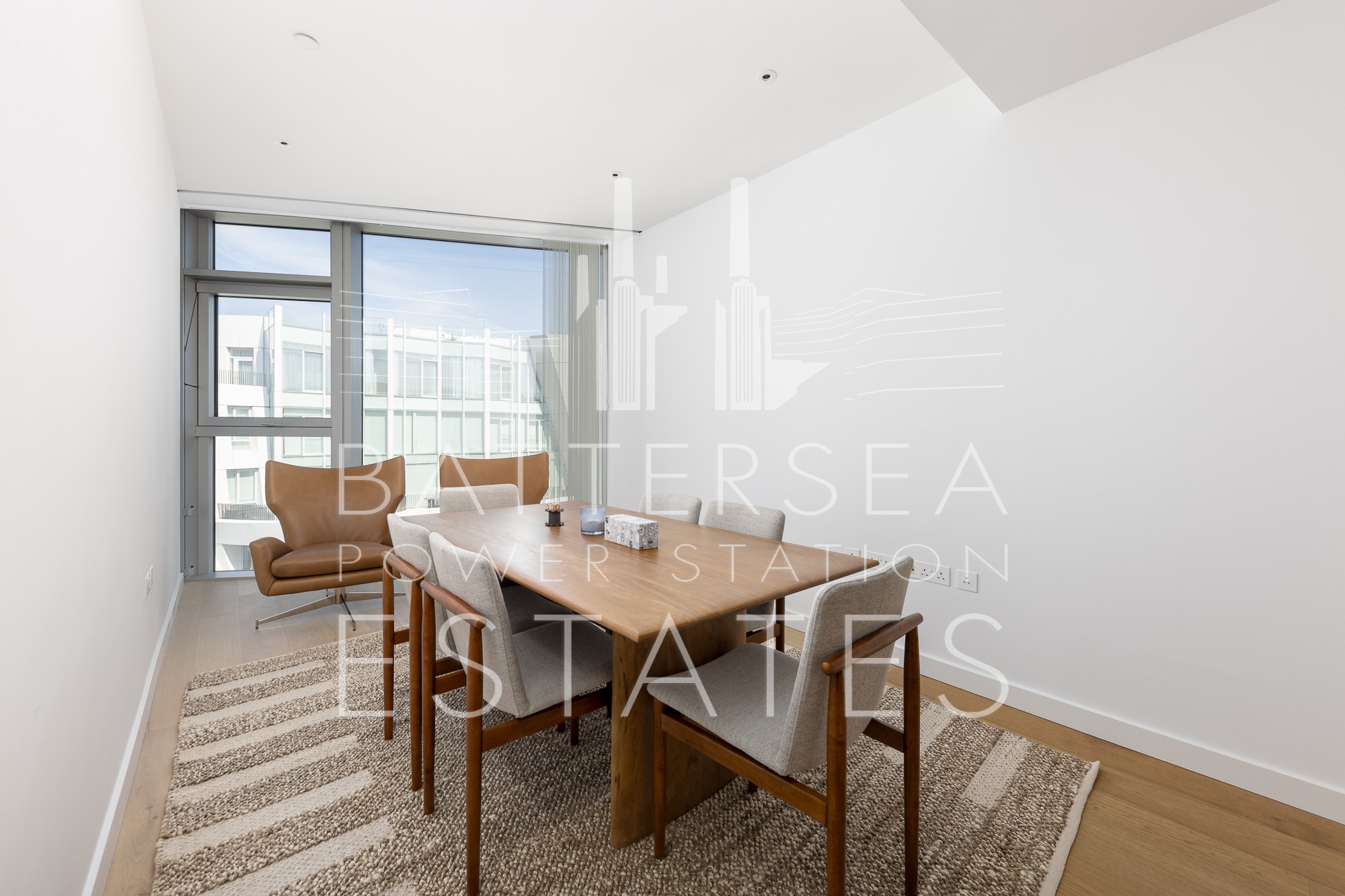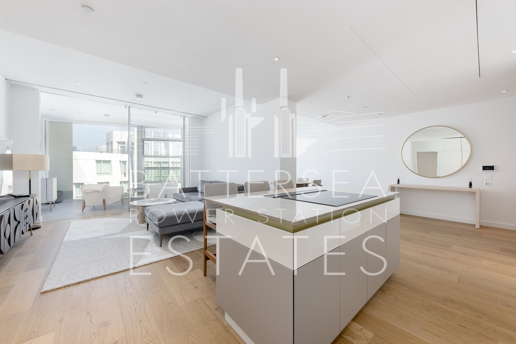This stunning apartment comprises of a modern open plan kitchen and dining space, that includes a kitchen island and Siemens integrated appliances and a bright reception room benefitting from floor to ceiling windows which flood the room with natural light. The winter garden of 116 sq ft provides additional entertaining space and offers wonderful views over the Gehry buildings and the iconic Power Station with the River Thames in the distance. There is a fantastic master suite with extensive built in storage and en suite, as well as two further well proportioned bedrooms with en suite and a separate guest WC, all with views towards the Power Station. Finished to an exceptional standard with wood flooring throughout, the apartment has a heating and cooling system in the living room and bedrooms and underfloor heating in the bathrooms.