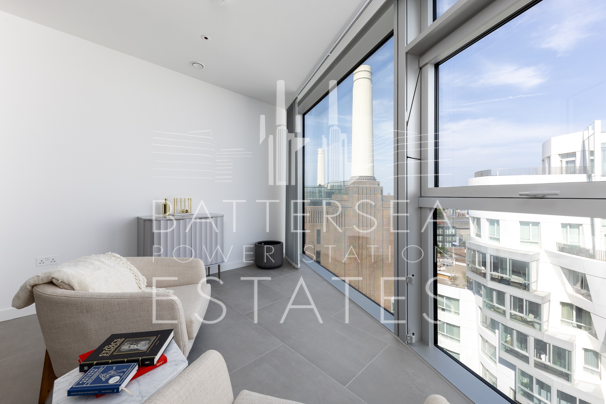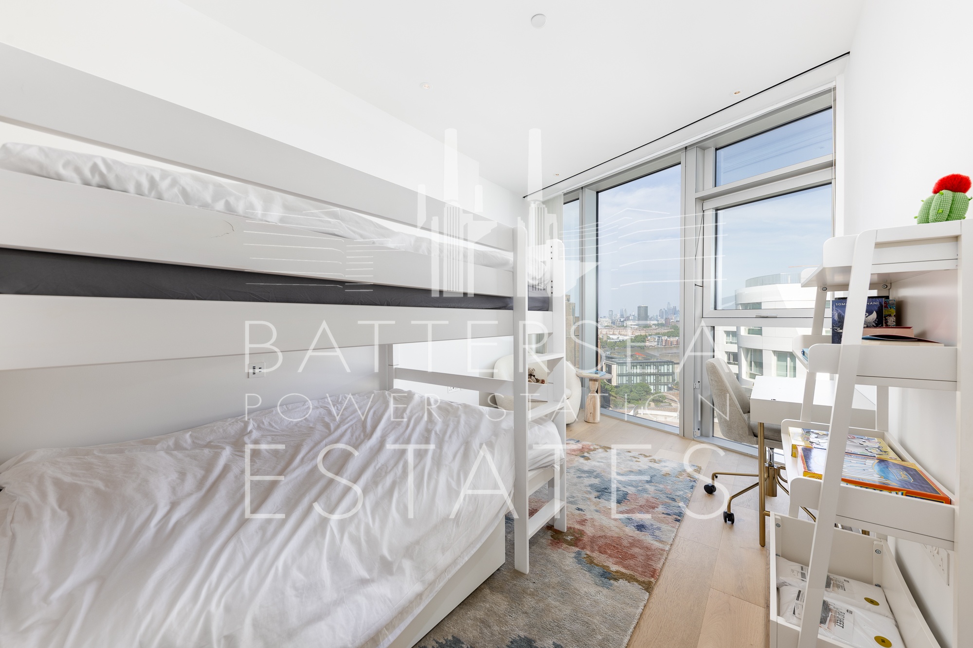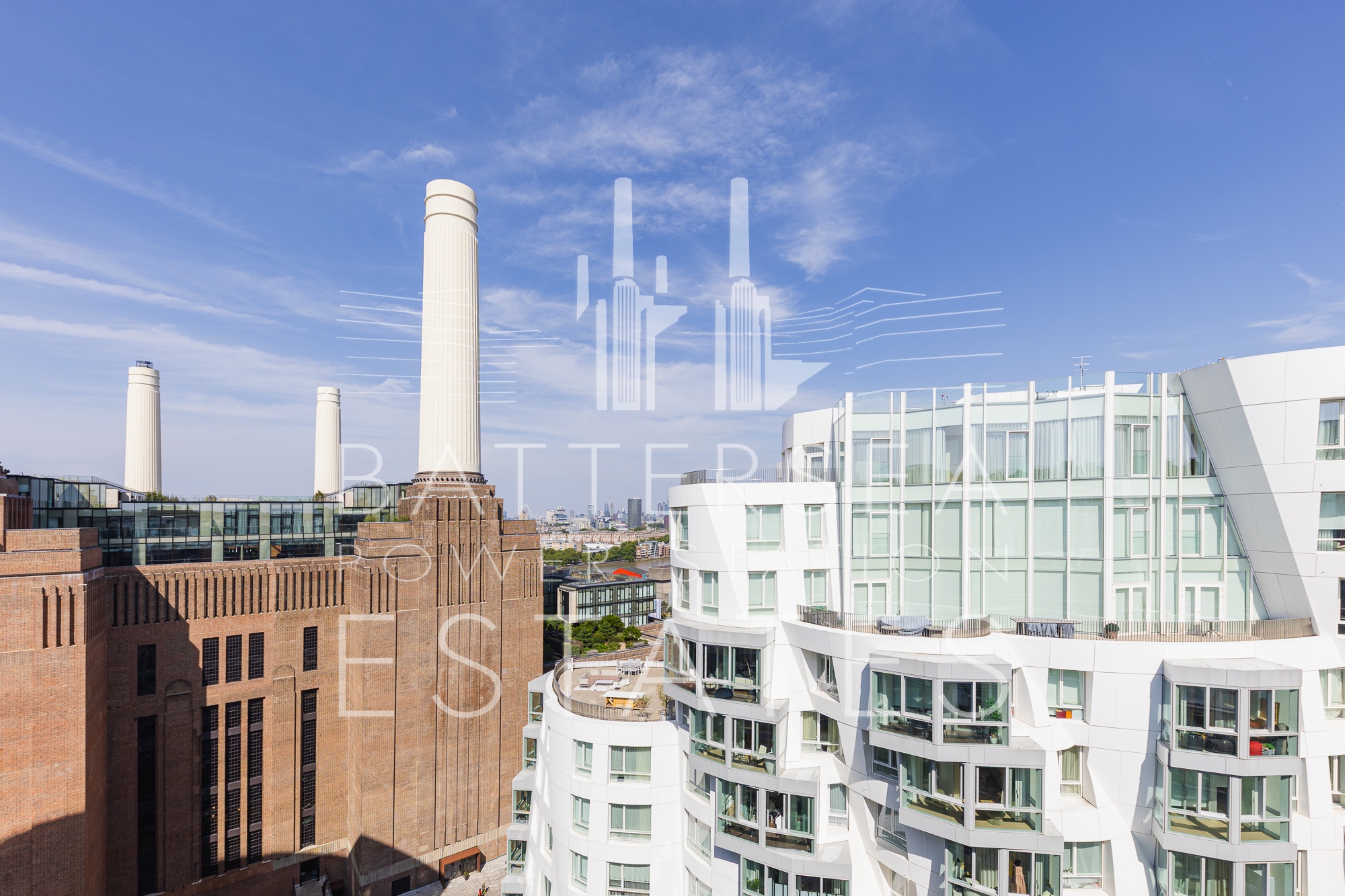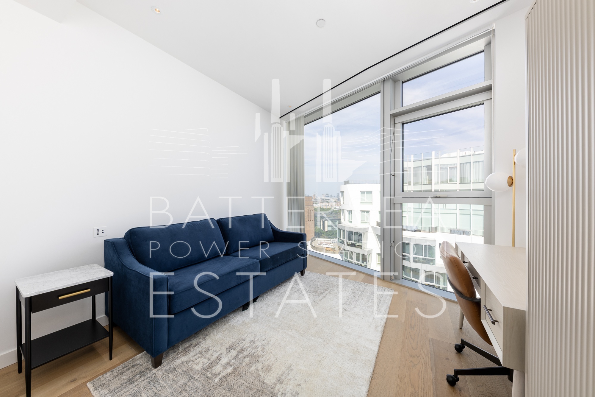 This stunning apartment comprises of a modern open plan kitchen and dining space, that includes a kitchen island and Siemens integrated appliances and a bright reception room benefitting from floor to ceiling windows which flood the room with natural light. The winter garden of 116 sq ft provides additional entertaining space and offers wonderful views over the Gehry buildings and the iconic Power Station with the River Thames in the distance. There is a fantastic master suite with extensive built in storage and en suite, as well as two further well proportioned bedrooms with en suite and a separate guest WC, all with views towards the Power Station. Finished to an exceptional standard with wood flooring throughout, the apartment has a heating and cooling system in the living room and bedrooms and underfloor heating in the bathrooms.