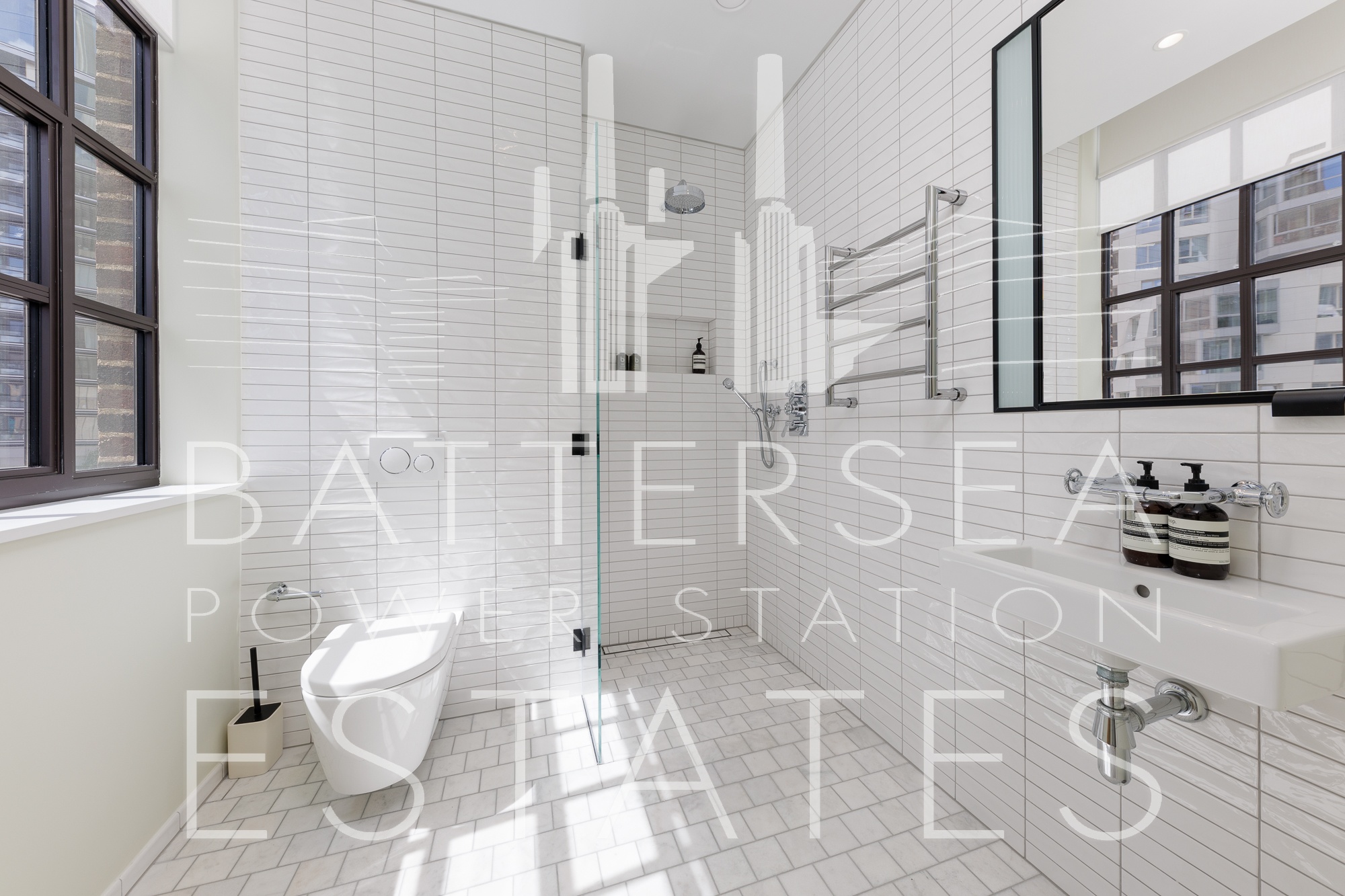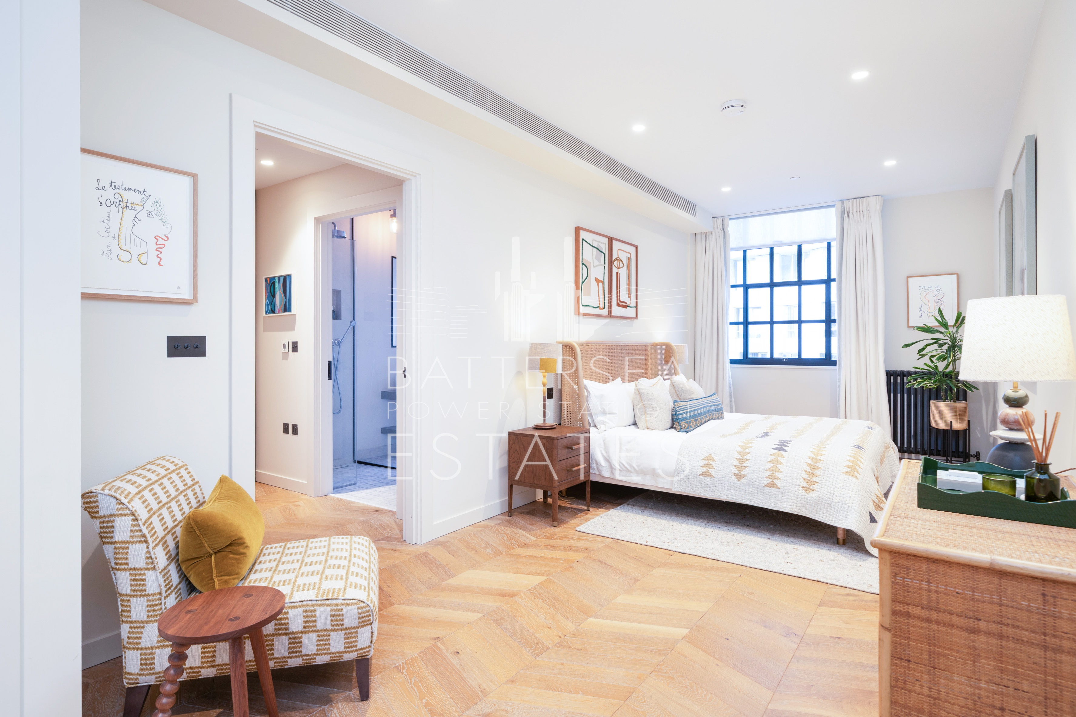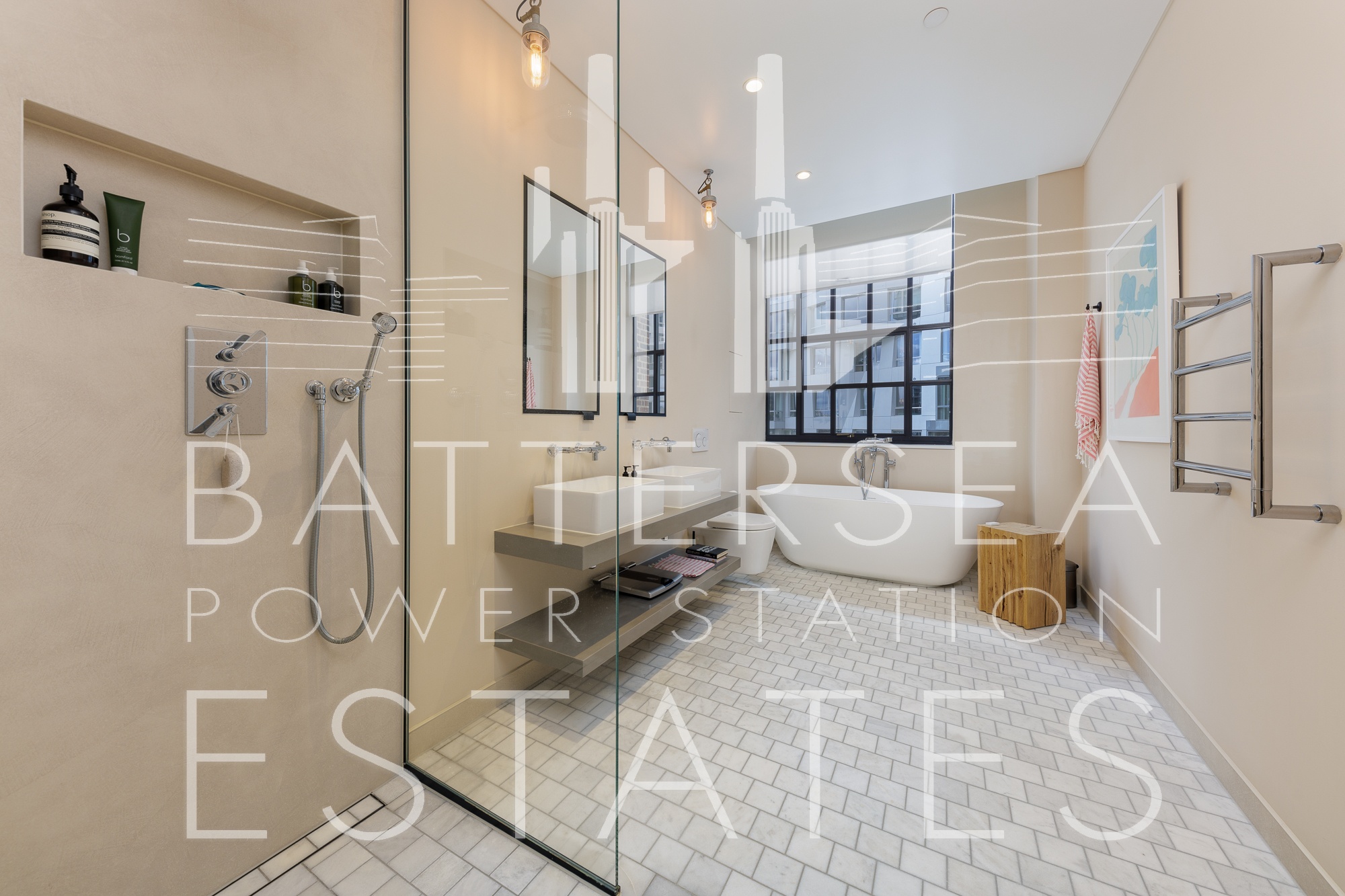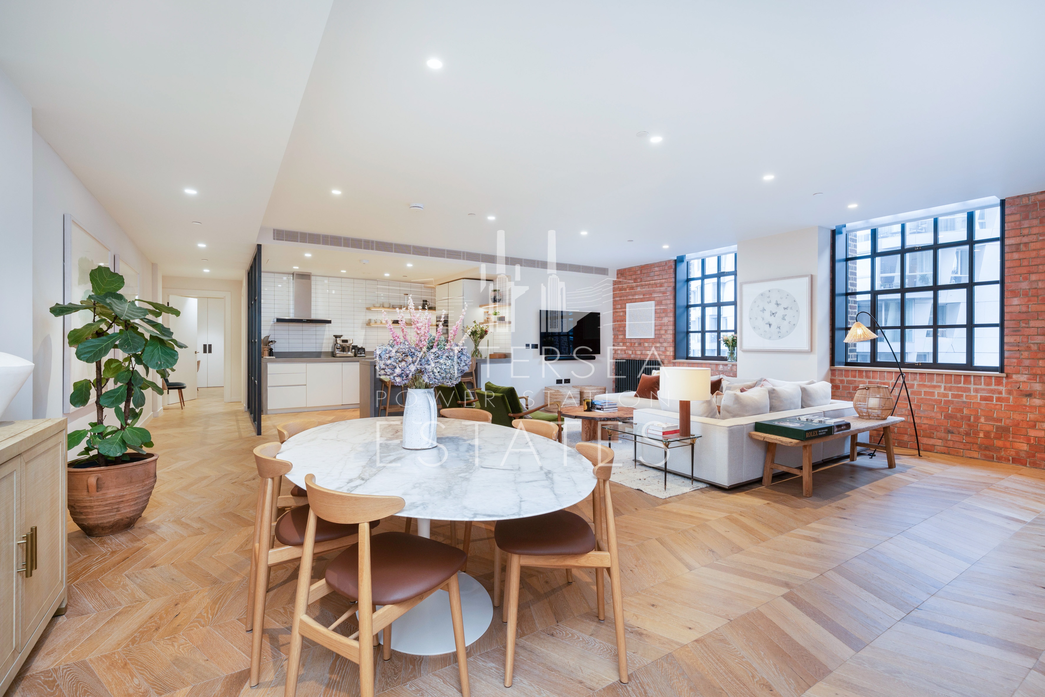 This apartment offers two large ensuite bedrooms as well as a guest w/c. Its south aspect allows plenty of natural light to flood through the large windows. Offering exposed brick interiors, crittall window's and finished to an exacting standard with wood flooring throughout, this apartment has a heating and cooling system in the living room and bedrooms and underfloor heating in the bathrooms. Further benefits include exclusive access to the apartment via the Boiler House Concierge.